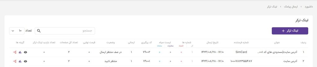 بعد از تأیید نهایی، پیامکها ارسال میشوند و وضعیت آنها در لیست پیامها در دسترس قرار میگیرد: