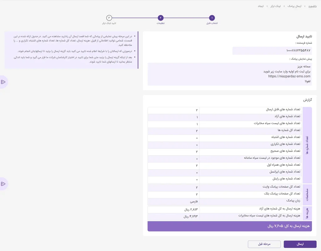 در این مرحله پیش نمایشی از پیامکی که شما قصد ارسال آن را دارید مشاهده می کنید. در جدول ارائه شده در این قسمت، شما می توانید اطلاعاتی از قبیل: هزینه ارسال، تعداد کل شماره ها، تعداد شماره های اشتباه، تکراری و ... را ملاحظه کنید.